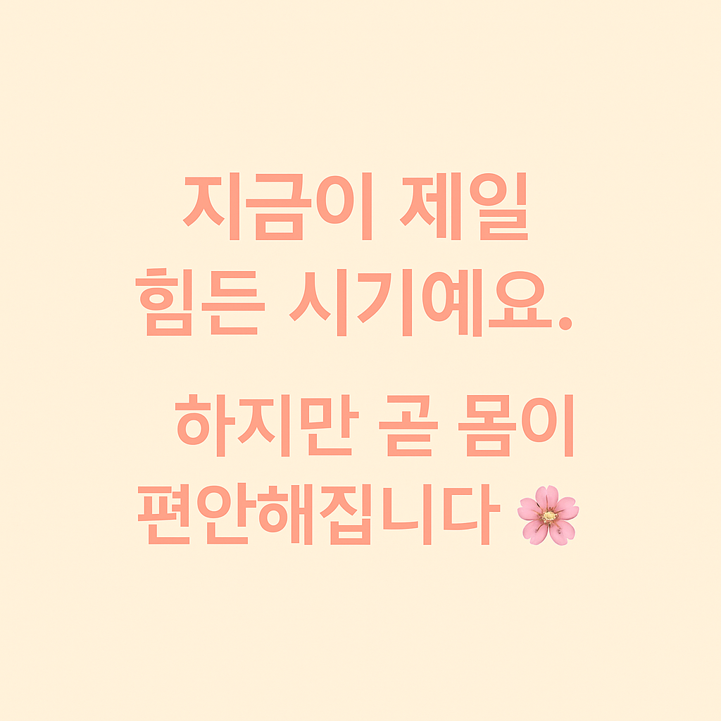 지금은 기다림의 시간입니다. 몸이 알아서 일하고 있으니 억지로 조절하려 하지 않아도 괜찮습니다. 느리게, 천천히, 그리고 불편한 그 리듬을 있는 그대로 허락해 주세요. 이 시기는 결코 영원하지 않습니다. 단 몇 주만 지나면, 몸은 새 리듬에 완전히 적응하고, 마음도 훨씬 평온해질 것입니다. 그리고 그 순간, 지금의 불편함은 ‘아, 그때도 내 몸이 열심히 일하고 있었구나’라는 감사함으로 바뀌게 됩니다. 그러니 오늘 하루도 너무 애쓰지 말고, 그냥 이렇게 느린 속도 그대로 괜찮습니다. 몸은 이미 아기를 위해 완벽히 준비되고 있으니까요.